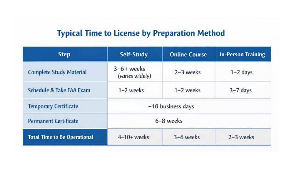 Classroom students usually finish their training and take the test within 1-2 weeks. Online learners tend to spread their studies over 2-3 months. This faster timeline means you'll start earning sooner, which makes the extra cost minimal. A couple of drone service jobs will easily cover the difference in training costs.